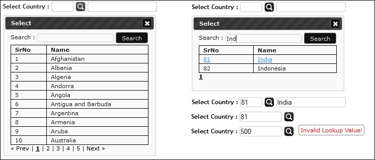 Other capabiliteis of the Lookup Control, like searching, paging and some basic validations, are handled using jQuery and JavaScript as in the following: