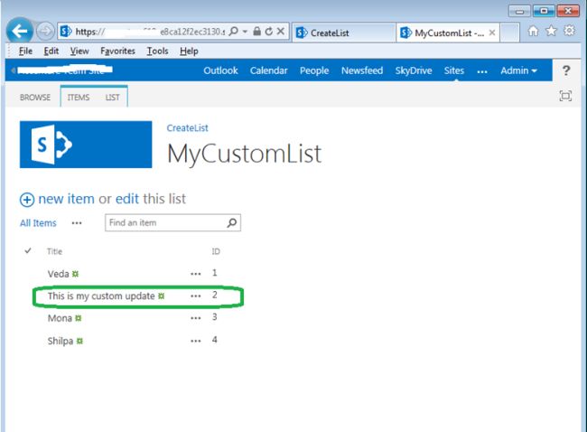 - To see the item that was updated, go back to the “MyCustomList” URL.