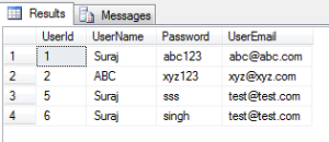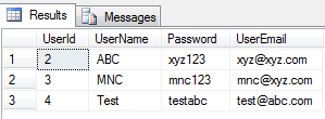 Here as you can see we have added only the three column values since the primary key userId is auto-incremented, in other words an Identity column. Thus, this adds the values. For a faster approach, usually developers use the SSMS UI here also to add the records. We right-click on the specific table into which we will be adding records, then click on the Edit Top 200 (default value) items. Then we see in a new query window the table columns with the rows of records already added and a default empty row where we will be adding the values as in the following: