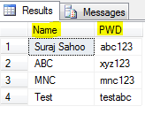 The preceding query returns only the User name column as Name and the word column as PWD in the result set. This is the power of aliases, it changes the column head names. The following is the sample result set: