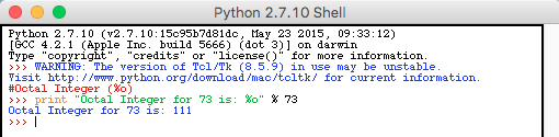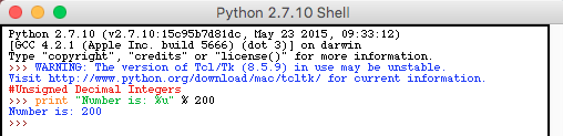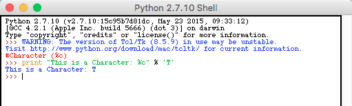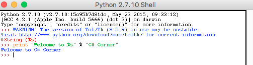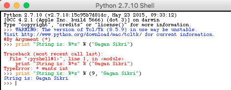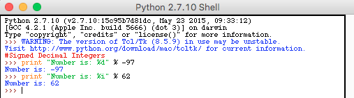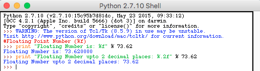 Python supports formatting values in strings which can involve most basic usage to very complex expressions. Python uses same syntax used in printf() function in C. The following are some format symbol and their implementations:
