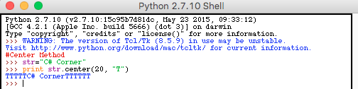 This method returns a string with the string passed and fills character passed to center the original string passed along with fill character. It consists of two parameters and they are as in the following,