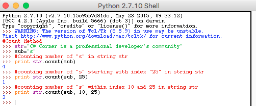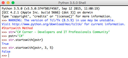 This method checks whether a string starts with parameter string supplied or not. It will return true if it starts with parameter string else it will return false. Startswith method can be restricted by passing starting and ending indexes. It consists of three parameters and they are explained below: