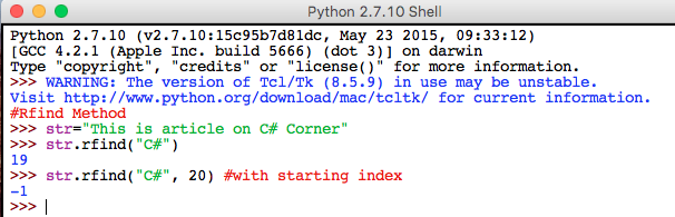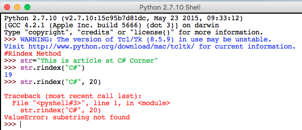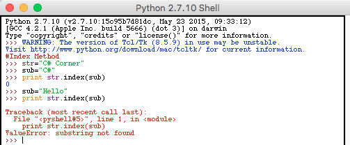 This method returns last index of sub-string specified else it raises an exception error. It is similar to rfind method. It consists of three parameters and they are explained as below: