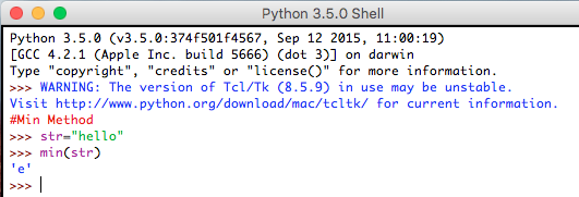 This method returns the minimum alphabet character from string specified. It consists of one parameter and it is explained below: