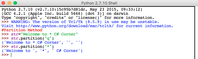 This method is used to divide the string into multiple strings on the arrival of the character specified. If the character is not found in the string then it will return the original string along with two empty strings. It consists of one parameter and it is explained as below: