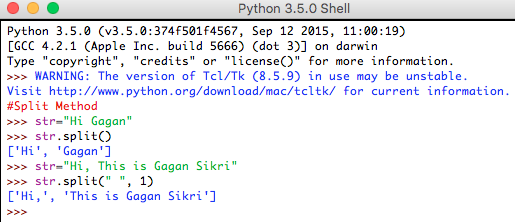 This method returns the list of all substrings in the input string specified, using delimiter string used as separator. By default, if no delimiter is specified then whitespace is considered as the delimiter. It consists of two parameters and they are explained below:
