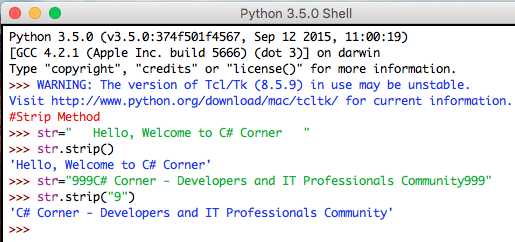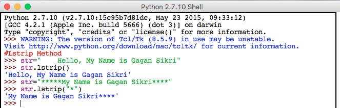 This method is used to strip all characters at the beginning (left) of string. By default, it will strip whitespace. It consists of one parameter and it is explained as below: