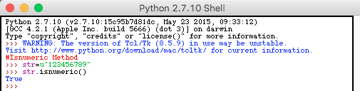 This method is used to check if the string consists of only numeric characters. It is similar to isdigit method, the only difference is that this method can only be used with Unicode objects. It will return true if all characters are numeric else it will return false.