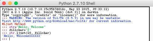 This method is used for left justification in a string of length specified as a parameter. The original string is returned if width (length specified) is less than or equal to the length of the string. It consists of two parameters and they are explained as below: