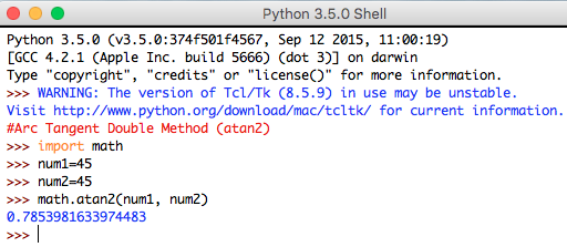 Syntax: math.atan2(num1, num2)