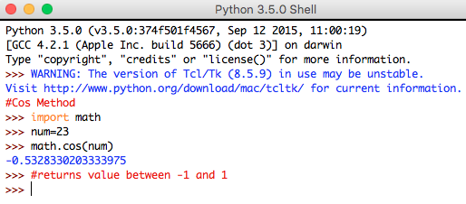 - Cosine Method: This method returns the cosine value of the number specified as an input in radians. It returns the value between -1 and 1 and consists of one parameter and it is explained below,