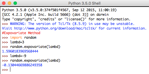 It is based on exponential distribution. This method returns a random value greater than 0 and less than positive infinity as long as the value of lambda is positive, while a value greater than 0 and less than negative infinity if the value of lambda is negative. Lambda should be greater than 0. It consists of one parameter and it is explained below: