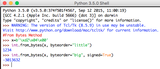 Syntax: int.from_bytes(bytes, byteorder, *, signed)