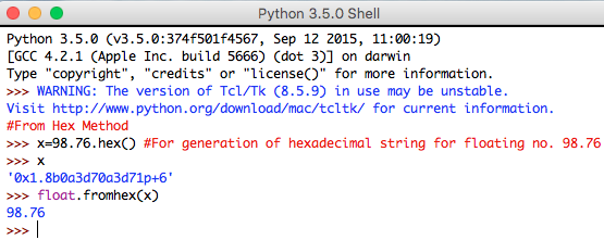 - From Hex Method: It is a class method. It returns the floating-point number represented by the hexadecimal string specified as input. It consists of one parameter and it is explained below: