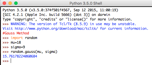 Syntax: random.gauss(mu, sigma)