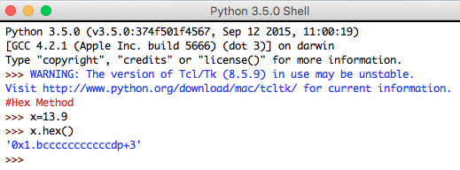 - Hex Method: It is an instance method. This method returns a hexadecimal string for a floating-point number specified as input. For finite numbers, the hexadecimal string is led by the prefix "0x" and postfixed by "p" and exponent.