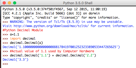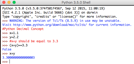 In the example above, the sum of x = 1.1 and y = 2.2 should be equal to 3.3 but rather it is equal to 3.3000000000000003. This is because floating-point numbers are implemented in computer hardware as binary fractions. Because of this, most of the decimal fractions cannot be accurately stored. This may bring serious problems in research and banking sectors, though this type of deviation is very small. However, both 3.3 and 3.3000000000000003 will never be equal.
