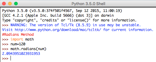 Syntax: math.radians(num)
