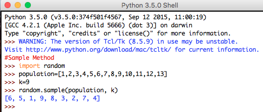 This method returns a random sample list of the length specified as input, from the sequence/population list specified. There are no elements replaced in this method. The Value Error is raised if the specified sample size is larger than the population size. It consists of two parameters which are explained below: