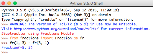 Syntax: Fraction("num1") - Fraction("num2")