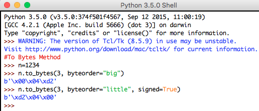 Syntax: int_num.to_bytes(length, byteorder, *, signed)