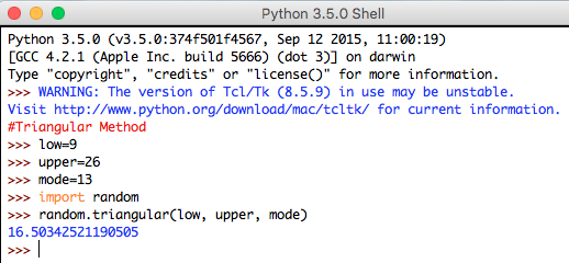 Syntax: random.traingular(lower, upper, mode)
