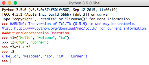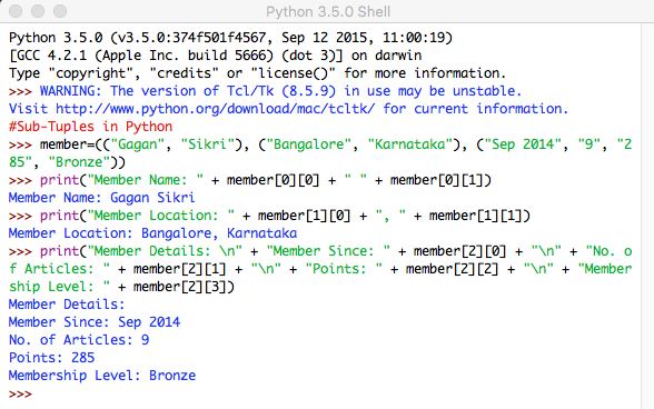 - Python also supports slicing index in Tuples which allows accessing multiple elements of tuple at once. Below is an example of slicing in tuples.