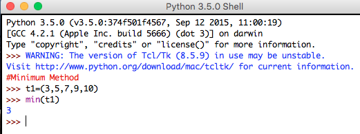 - Minimum Method: This method is used to determine the minimum element in a tuple. It consists of one parameter and it is explained as below: