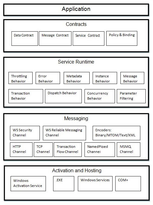 - Activation and Hosting (Layer 4): This layer supports the execution of services in various environments, such as Windows Services, IIS and Windows Activation Services (WAS). A service can either be self-hosted or hosted in the context of another application. Let us briefly learn about them.