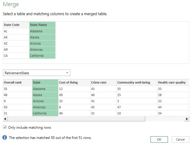 Note: We will receive a warning below as "The selection has matched 50 out of the first 51 rows" and tick on the Only include matching rows checkbox. We have one extra row ( District of Columbia ) in our StatesCodeInfo table. That's why it is giving us a warning: The selection has matched 50 out of the first 51 rows.