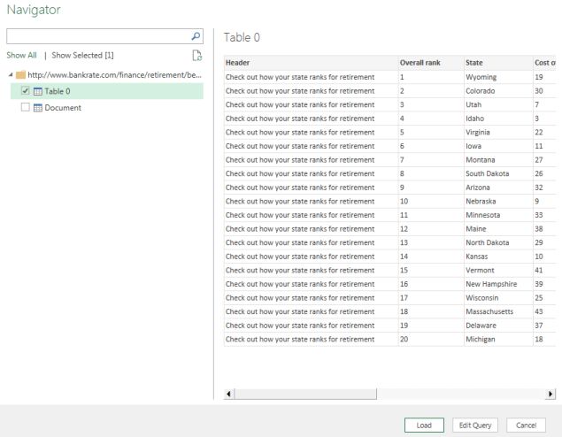 The navigator window returns what it found on the web page. Here in our example, the navigator found a table ( Table 0 ) and the overall web document. Select the table and the navigator will display the preview of the table. Before loading the table we will edit the query by selecting Edit Query from bottom of the navigator window.