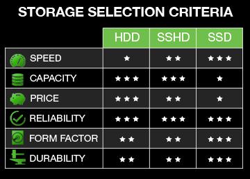 Figure1: Storage selection criteria for HDDs, SSDs and SSHDs.