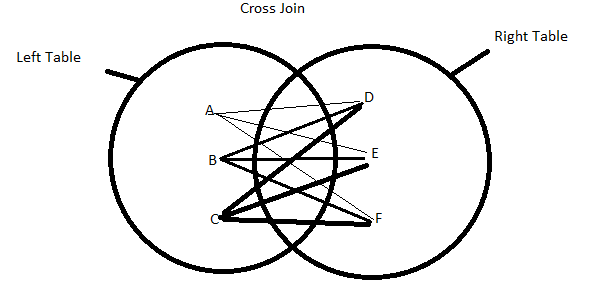 The result of this cross join is: {(A,D),(A,E),(A,F),(B,D),(B,E),(B,F),(C,D),(C,E),(C,F)};
