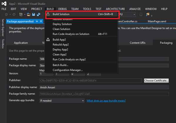 Go to the folder and search App packages folder in the App folder and you will find “yourappname.aapxupload”. For me it is “app2.appxupload”. This file can be used to upload in the windows store.