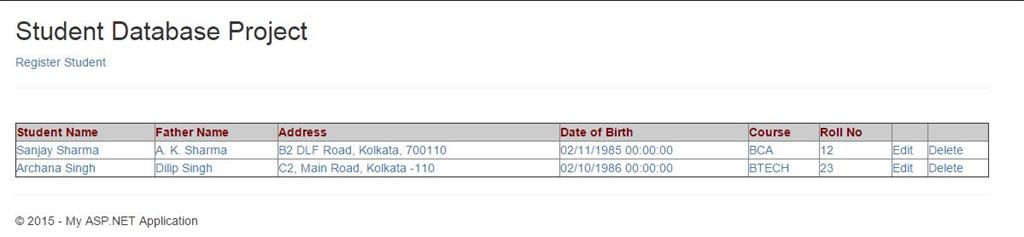 Now run the projects. Click on Register Student Button and save student details. Then click on Back to Index page and students list will appear as in the following screenshot: