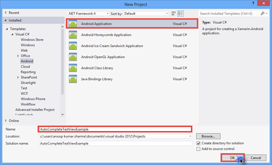Activity1.cs, create a String Array (named names) for displaying the AutoComplete Suggestion and an ArrayAdapter for filling in the View, AutoCompleteTextView, with the list of names (Array). We have also created a btn_Submit.Click event. On clicking the btn_Submit it will display the text present in autoComplete1 (AutoCompleteTextView) in a Toast message and if AutoCompleteTextView is empty then Display a Toast Message (in other words Please Enter Name!).