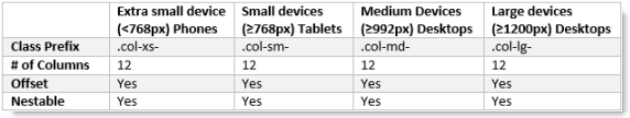 Bootstrap provides predefined grid classes for making layouts for various types of devices, like phones (<768px), tablets (≥768px), medium sized desktops (≥992px) and large devices (≥200px).