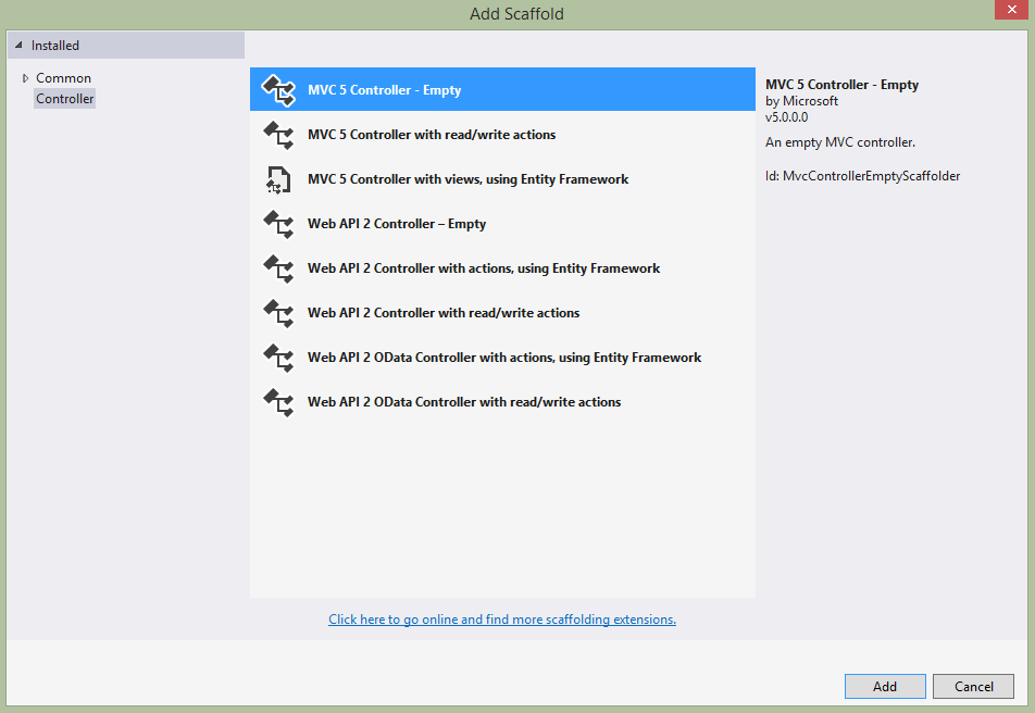We just need an Empty controller, to create our own functions (actions in MVC) for it to handle and perform.