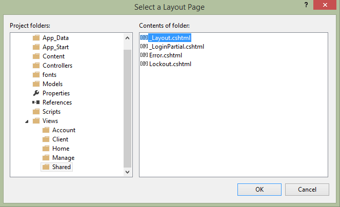 Creating a custom ViewNow that the back-end (Controller) code has been done you can now create the Views for your application. Views are used to show the content (data) of your application to the client (user) in HTML markup. Because a browser can only render HTML content, we will be using that markup and Views are used for that. Each controller has its own specific view. One thing to note here is that to return a View, the name of the View must match the Action's name. You can say that each of the Actions (functions) in the Controller is meant for a specific View (HTML document to be returned) in the application. We need four Views, for our four Actions, Index, Create, Update and Delete. To create a View you can click on the the Views folder and create a new folder. Remember, however, that here you don't need to create a new folder, because as I already said, when you created the Controller a new folder was already created with the name of the Controller, “Client”. Right-click that folder and inside the Add click on the MVC 5 View with Layout and click Next to go to the next step.