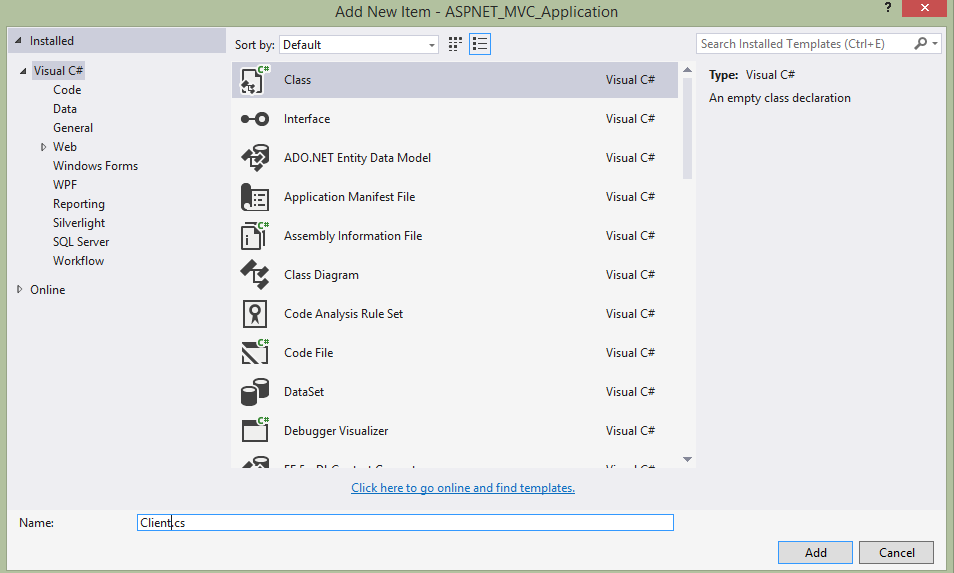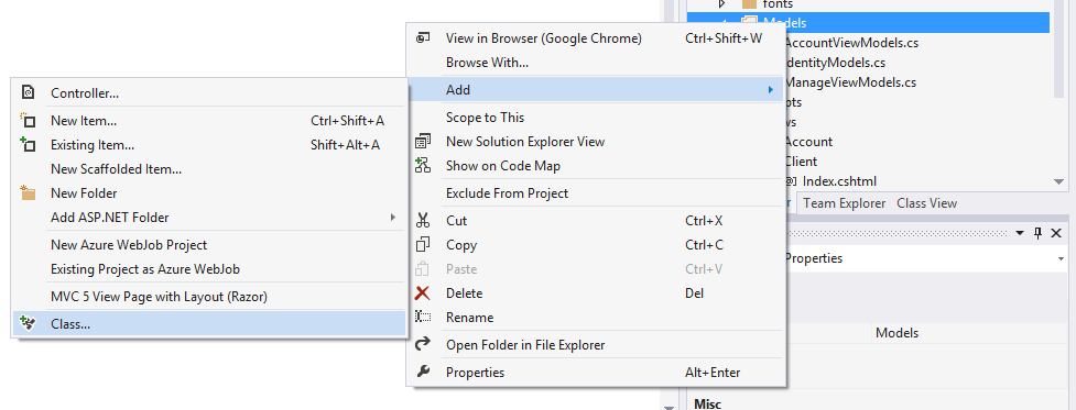 That is a simple C# class file that would serve our application as a Model. You will find that one other major change is the namespace this class is in. The name has an extra .Models attached to our project's name. That makes up our different fields. ASP.NET and Visual Studio do these things for us, although they're not required but just conventions to be followed. Let us create a Model for our application, click on the Models folder in your app and inside Add click on the Class file and name it Client.cs and click Next to continue.