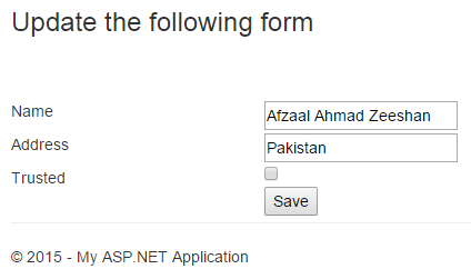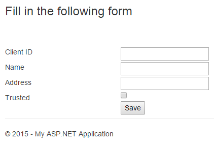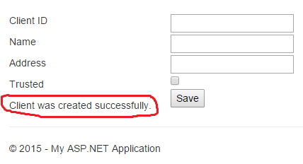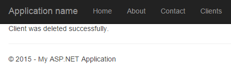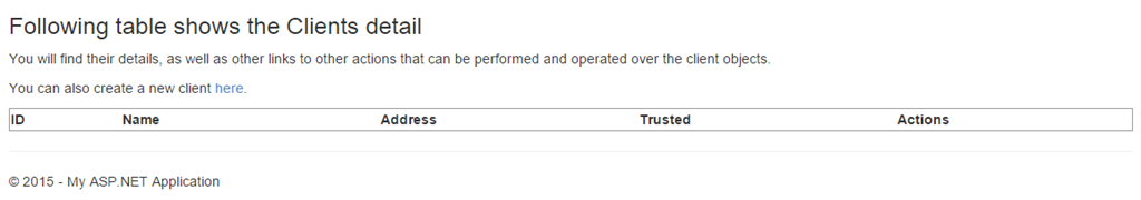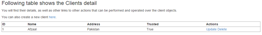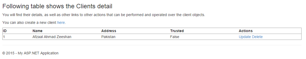 Let us now try to update this client's value. In the Actions attribute of the table, you will find two hyperlinks, they actually are just Actions (functions) of our controller, we will an (optional) ID of our client to it and then we will update the value. We will update our value as in the following: