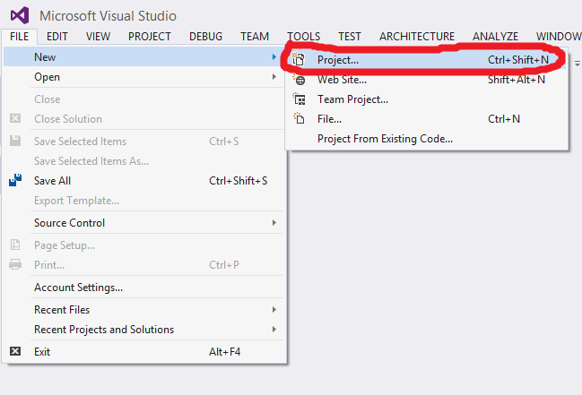 Let's have an example of a simple office, where a person gets multiple clients, whose name and address are stored. Just to distinguish among them, an ID is also stored. Whether the client is trusted or not, it is also stored along with him. The office manager wants to be able to create new clients and modify the existing ones and once he is done with them he wants to be able to delete the previous ones. To implement this basic example in ASP.NET MVC, we will start off by creating a simple ASP.NET MVC application. To do so, you can either press CTRL+SHIFT+N, or you can click on File, then New and a Project ("File" -> "New" -> "Project..."). Like this: