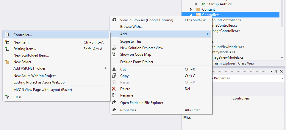 Default controllers in ASP.NET MVC applicationRight-click on the Controller folder and inside the Add option, click Controller to create a new one.