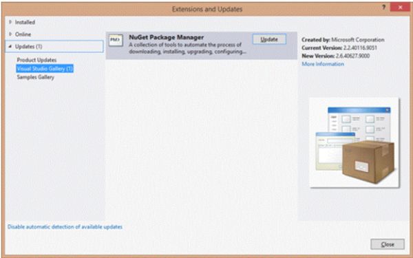 - Go to the Update Tab, then click on Visual Studio Gallery (a window like the following will be opened):