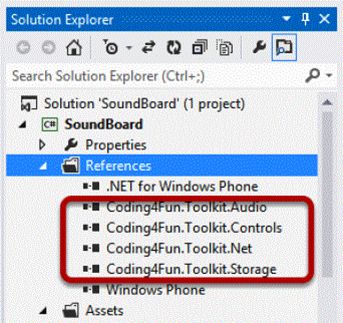 Close this window and explore Solution Explorer. In the Solution Explorer now you will see a set of new options regarding the Coding4Fun toolkit.