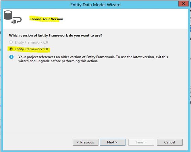 On clicking Finish it will show a box saying Model Wizard, just select any of the wizards depending on availability (in my case I am selecting Entity Framework 5.0).