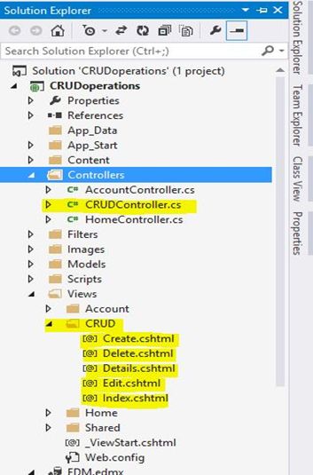 You can see the controller info on the preceding page but if you want to see their views then simply click on Views, it will show you a separate folder named CRUD and all the pages for the CRUD operations.