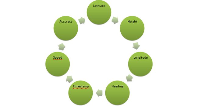 - timestamp: the time when the location information was obtained as well as the instance of the object created, defined by the attribute TIMESTAMP.