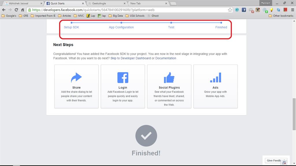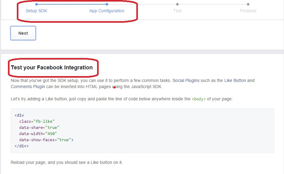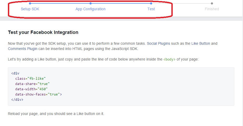 - Then here comes the next step, "Test". In this step you too check whether all that is working or not. They call it "Test Your Facebook Integration".